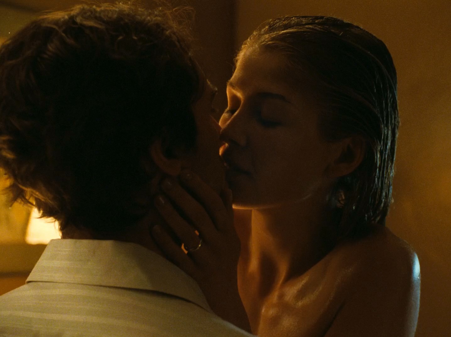 Rosamund Pike shows her tits while having sex and laughing with her man