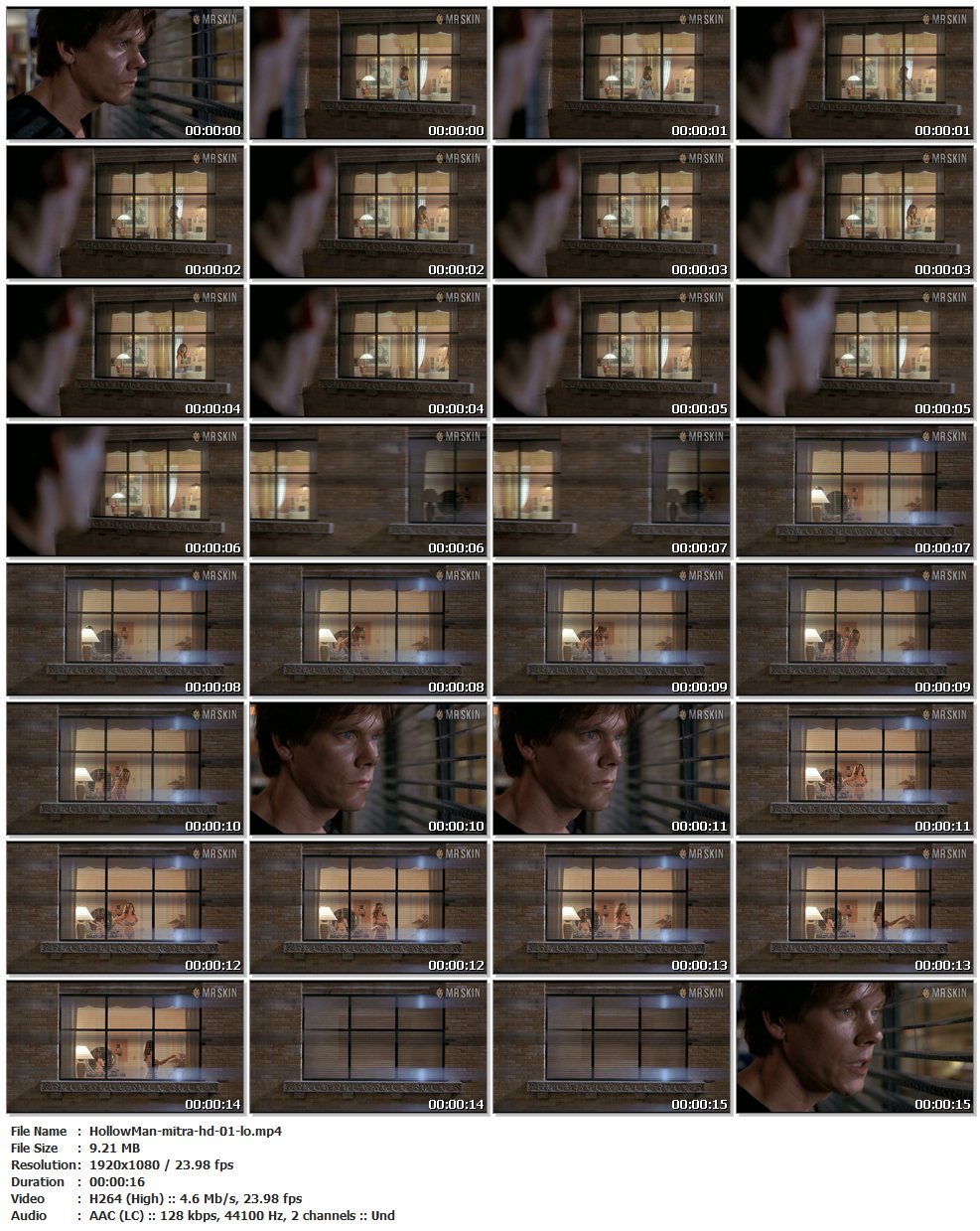 Nude, thong, breasts, underwear – 00:04:03 Kevin Bacon peeps through the window at Rhona Mitra undressing. The brief boobage flashed will turn you from Hollow Man to Solid Man! (16 secs)