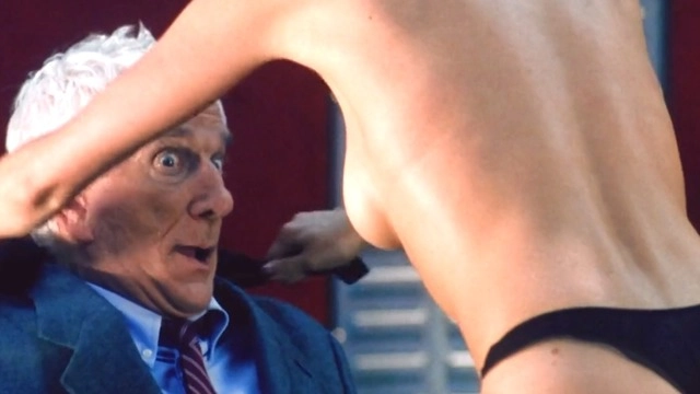 Nude, breasts, underwear, thong – 00:47:15 She does a sexy striptease for Leslie Nielsen. First bra & panties, then the bra comes off. Brief tits. (23 secs)