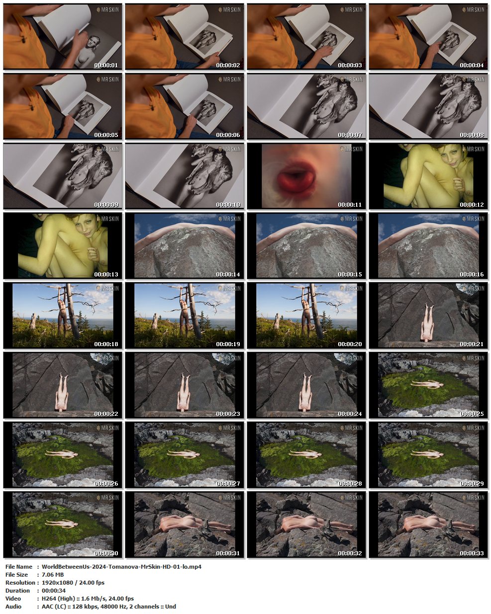 Nude, breasts, bush, butt – Marie flips through a book with naked photos, then we see pics of her enjoying the great outdoors completely in the buff. (34 secs)