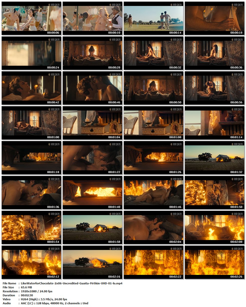 Nude, breasts, butt – Ep. 02×06 | 00:44:28 Everyone’s so happy at this wedding that they start taking off their clothes! Later, Azul and Andres finally get to have full-on, non-secret sex, and it’s so amazing that they burn the whole house down! (2 mins 30 secs)
