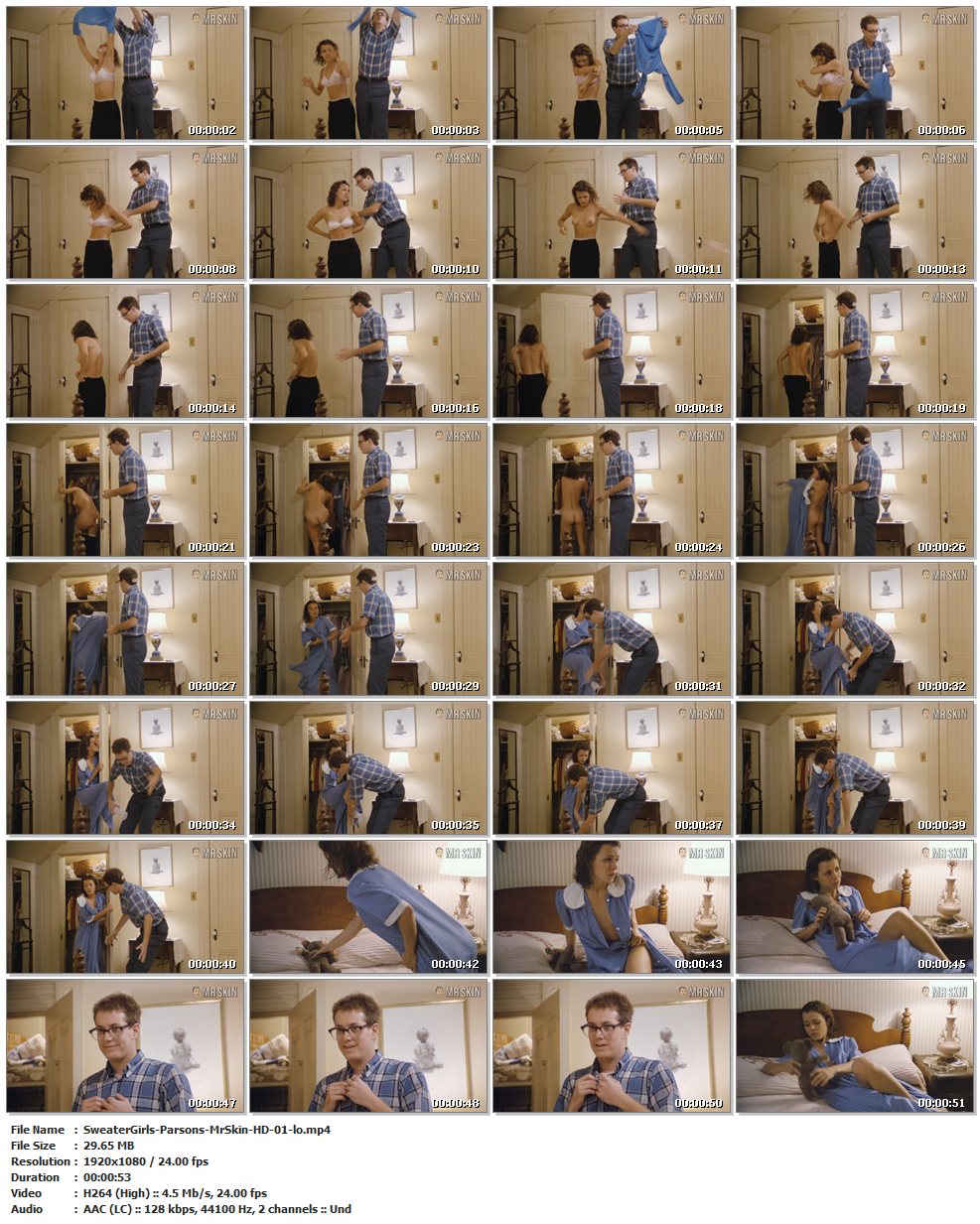 Nude, breasts, butt, underwear – 01:03:00 Julie strips off her wet clothes to reveal her terrific T’n’A. She puts on a dress but doesn’t fasten it all the way so we get a bit of cleavage when she lies on the bed. (53 secs)