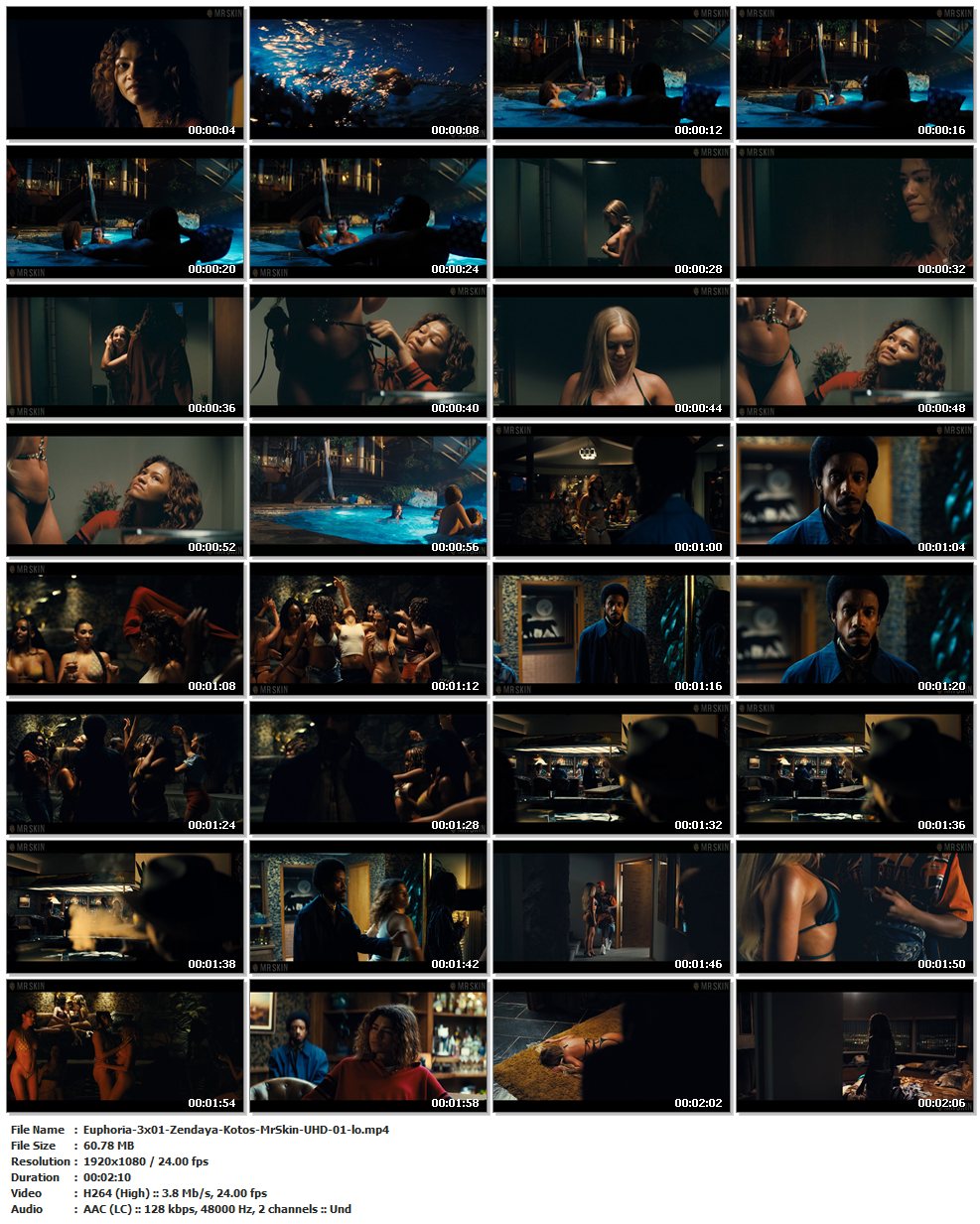 Nude (Emma Kotos) , bikini, breasts, thong – Ep. 03×01 | 00:45:40 Zendaya shows pokies while braless in a tank top, with lots of nude extras at the pool party, eventually helping a topless Emma get back into her bikini! (2 mins 9 secs)